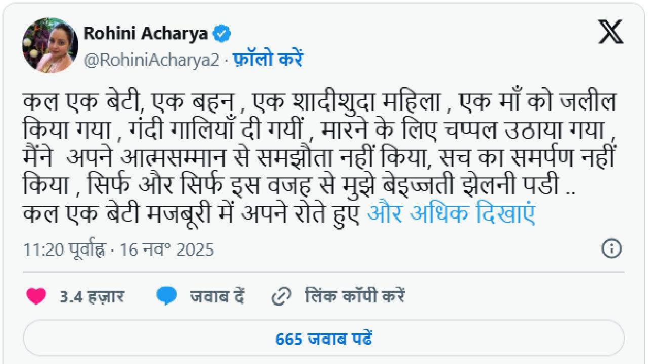 वहीं अब रविवार सुबह रोहिणी ने भावुक कर देने वाला पोस्ट लिखा। रोहिणी ने एक्स पर लिखा, कल एक बेटी, एक बहन, एक शादीशुदा महिला, एक मां को जलील किया गया, गंदी गालियां दी गईं, मारने के लिए चप्पल उठाया गया, मैंने अपने आत्मसम्मान से समझौता नहीं किया, सच का समर्पण नहीं किया, सिर्फ और सिर्फ इस वजह से मुझे बेइज्जती झेलनी पड़ी। कल एक बेटी मजबूरी में अपने रोते हुए मां-बाप बहनों को छोड़ आई, मुझसे मेरा मायका छुड़वाया गया, मुझे अनाथ बना दिया गया। आप सब मेरे रास्ते कभी ना चलें, किसी घर में रोहिणी जैसी बेटी-बहन पैदा ना हो।