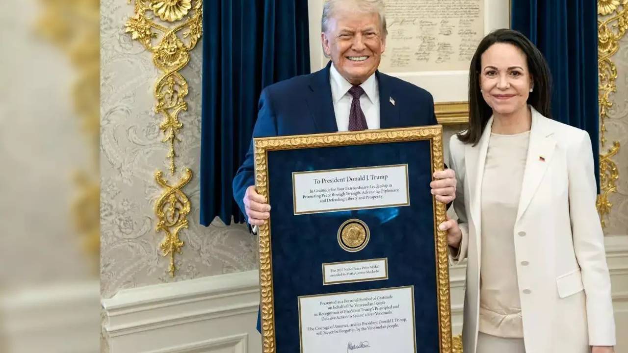Machado presented Trump Nobel Peace: वेनेजुएला की विपक्षी नेता मारिया कोरिना मचाडो ने व्हाइट हाउस में ट्रम्प को अपना नोबेल शांति पुरस्कार प्रदान किया। ट्रम्प ने व्हाइट हाउस में वेनेजुएला की विपक्षी नेता मारिया कोरिना मचाडो से मुलाकात की है और वेनेजुएला के राष्ट्रपति निकोलस मादुरो को अगवा करने के बाद किसी भी वेनेजुएलाई नेता से पहली मुलाकात थी। माचाडो ने कहा कि उन्होंने ट्रम्प को नोबेल शांति पुरस्कार का भेंट किया है। उन्होंने कहा, आज वेनेजुएलावासियों के लिए एक ऐतिहासिक दिन है। मचाडो ने स्पेनिश में कहा, हम राष्ट्रपति ट्रम्प पर भरोसा कर सकते हैं।