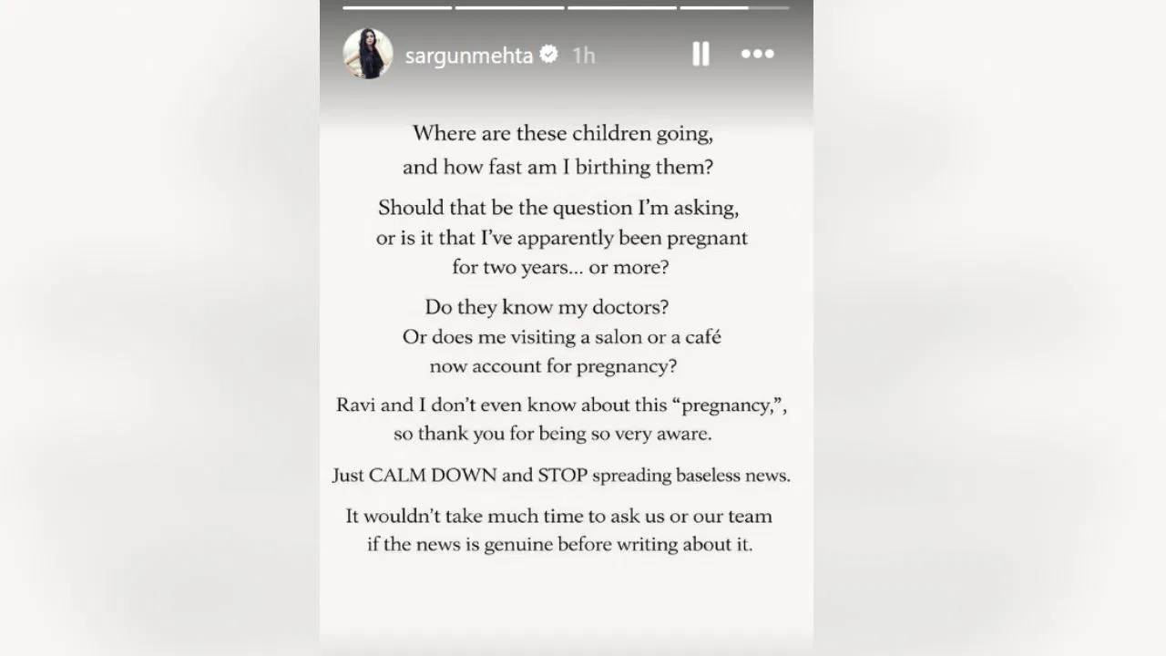 लेकिन जब बात हद से आगे बढ़ी, तो सरगुन मेहता ने खुद सामने आकर इन अफवाहों पर कड़ा रिएक्शन दिया। उन्होंने अपने सोशल मीडिया अकाउंट पर पोस्ट शेयर कर साफ कर दिया कि वह प्रेग्नेंट नहीं हैं और ऐसी खबरें पूरी तरह बेबुनियाद हैं। उनके इस जवाब ने इंटरनेट पर नई बहस छेड़ दी है।