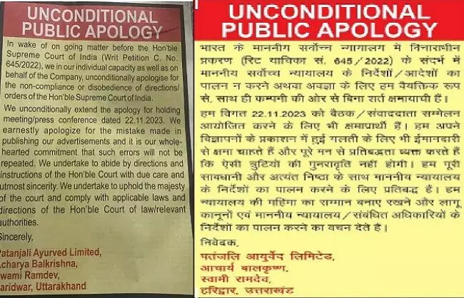 पतंजलि आयुर्वेद लिमिटेड का आज सुबह प्रकाशित विज्ञापन अखबार के पृष्ठ के एक-चौथाई हिस्से को कवर करता है। इस विज्ञापन का शीर्षक "बिना शर्त सार्वजनिक माफी" है। इसमें लिखा है, "भारत के माननीय सर्वोच्च न्यायालय के समक्ष चल रहे मामले (रिट याचिका सी. संख्या 645/2022) के मद्देनजर हम अपनी व्यक्तिगत क्षमता के साथ-साथ कंपनी की ओर से गैर-अनुपालन या अवज्ञा के लिए बिना शर्त माफी मांगते हैं। इसे भारत के माननीय सर्वोच्च न्यायालय के निर्देशों या आदेशों के बारे में यह पढ़ा जाए।"