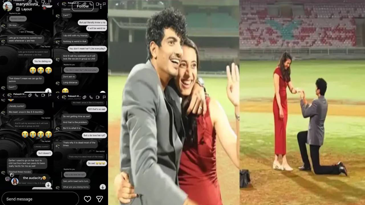 चैट्स मई 2025 की हैं और इसमें पलाश महिला को स्विमिंग के लिए इनवाइट करते हैं, जब महिला उनसे रिश्ते की स्थिति के बारे में पूछती है, तो वह टालमटोल करते हैं और लगातार मिलने के लिए कहते है। कई यूजर्स ने चैट्स की असलियत को लेकर सवाल खड़े किए है। स्मृति की शादी टलने के कुछ घंटे के भीतर चौंकाने वाली खबर है। पलाश की अचानक तबीयत बिगड़ने पर अस्पताल में भर्ती कराया गया, जहां से उन्हें मुंबई शिफ्ट किया गया। स्मृति ने अपने इंस्टाग्राम से शादी से जुड़े कई पोस्ट हटा दिए हैं, जिसमें उनकी इंगेजमेंट की तस्वीरें भी वायरल हो रही है।